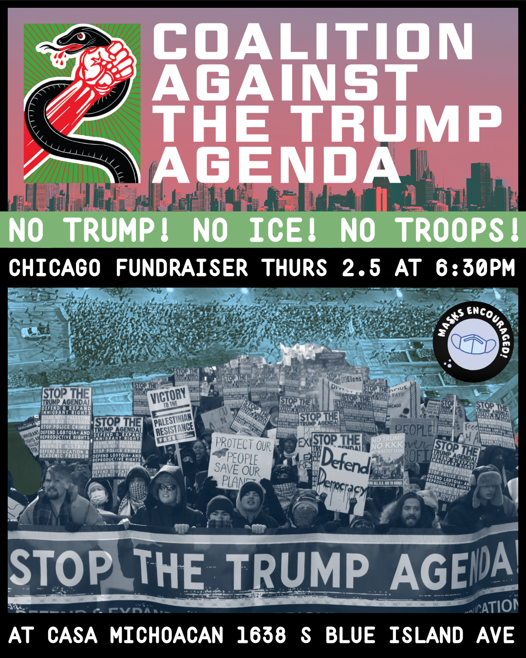 Since Trump took office, the Coalition Against the Trump Agenda (CATA) has been in the streets fighting the racist and reactionary agenda of this administration. A coalition that began as 35 groups in February 2025 has grown to over 100! Join us as we raise money to continue the fight against Trump’s assault on immigrants, labor, LGBTQ communities, and his moves to war in the Caribbean and elsewhere. When it was announced that hundreds of Texas National Guards were deployed to a military base in Joliet, Illinois, CATA called an emergency protest which brought 7,000 people out to oppose the guard entering Chicago.